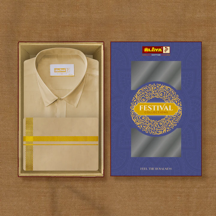 The Sandal-coloured outfit is perfect for weddings, thanks to the Silk fabric, full sleeve shirt, and 3.65-meter Dhoti